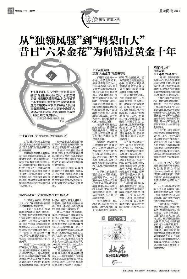 1月18日,东方今报一版封面重磅推出“豫酒振兴·河南之问”,引发全城热议:河南肥沃的市场土壤,为何长不出本土豫酒的参天大树?记者就此问题走访相关专家及白酒经销人员,回望白酒市场上一次大变革中豫酒“六朵金花”的应对与兴衰,试图从中寻找答案,助力豫酒振兴。