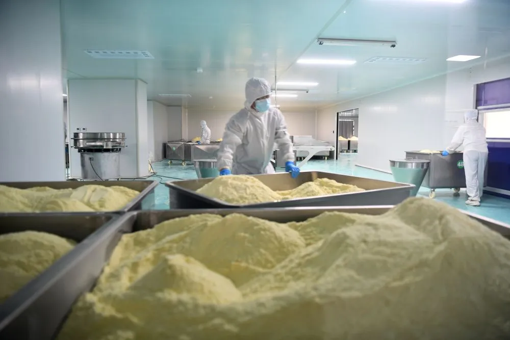 12月23日,工人在石家庄市栾城区的石家庄鑫源饮品有限公司筛粉车间里忙碌。