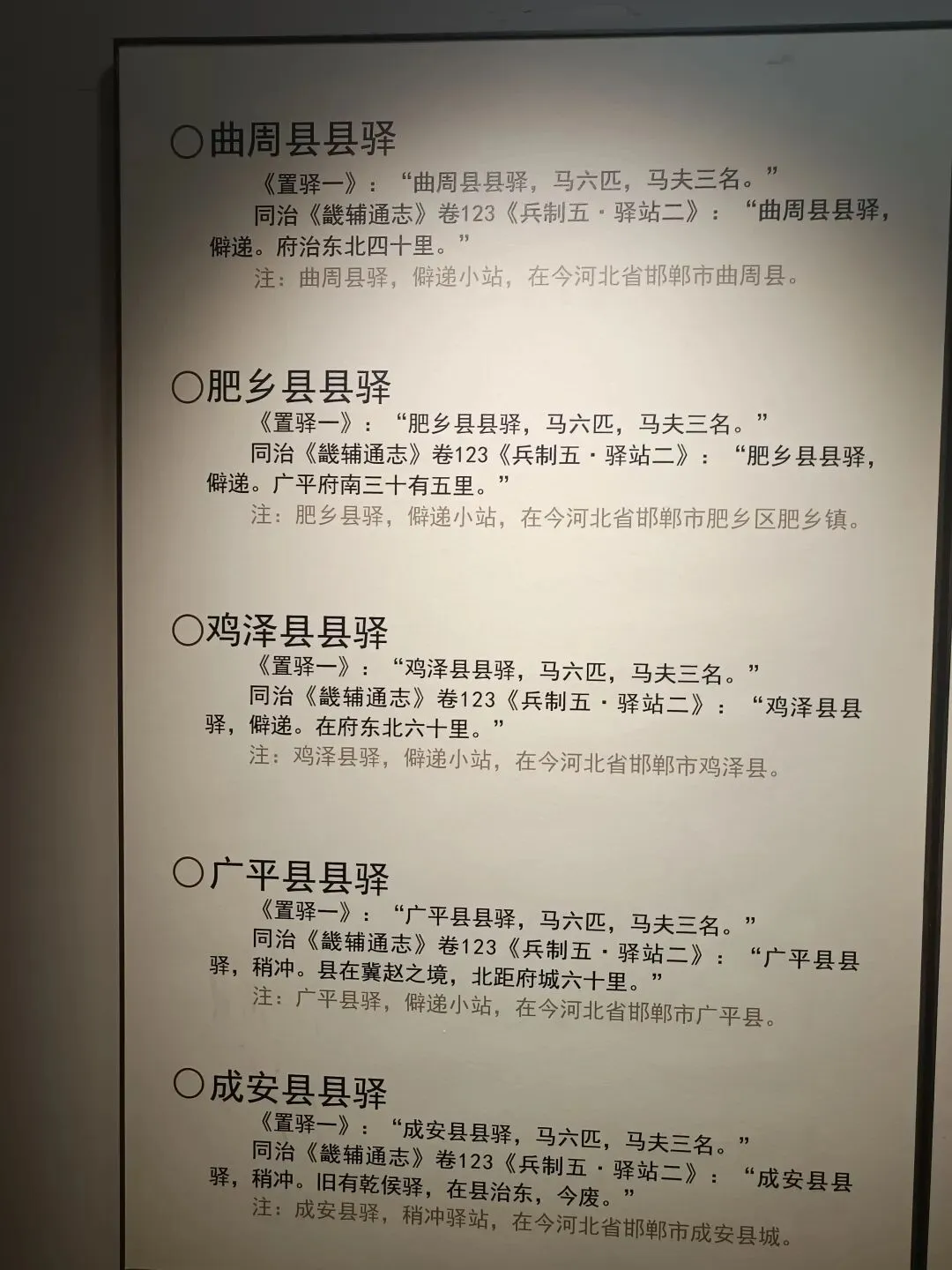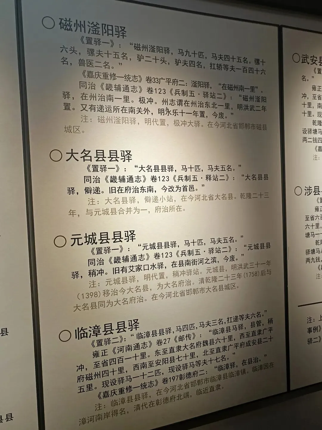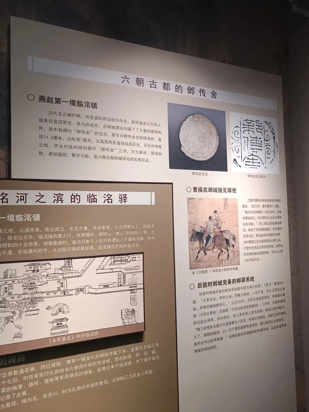 作为邯郸全域驿道文化的缩影,这里还梳理了各县古驿站脉络,连通大名、永年、磁县等县域古驿站点,再现当年邯郸府下辖驿站互通的交通格局。游人在此可明晰各县驿站职能,遥想古时从邯郸驿出发,奔赴各县传递文书、转运物资的繁忙景象,是读懂邯郸及下辖县域古驿道文化的重要窗口。