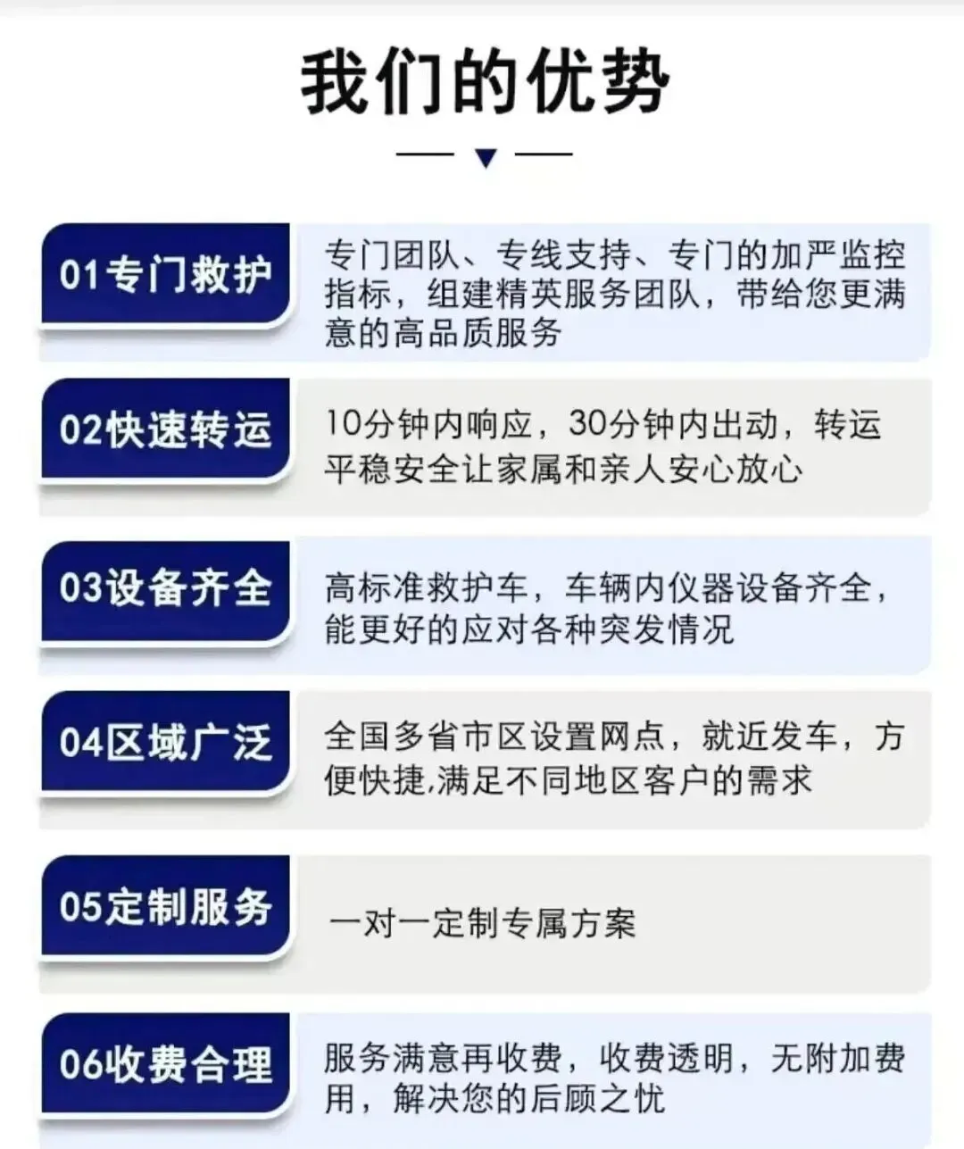 ✅ 特殊转运服务:涵盖跨省转院、遗体转运等个性化需求,全程规范操作,尊重生命,守护尊严。