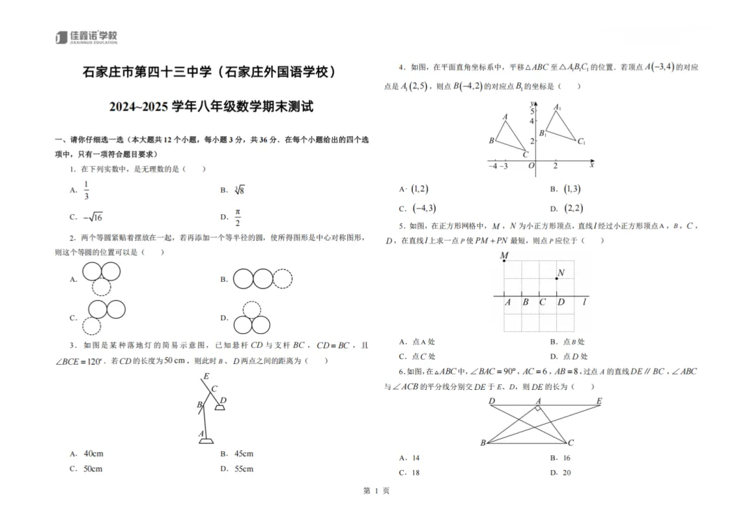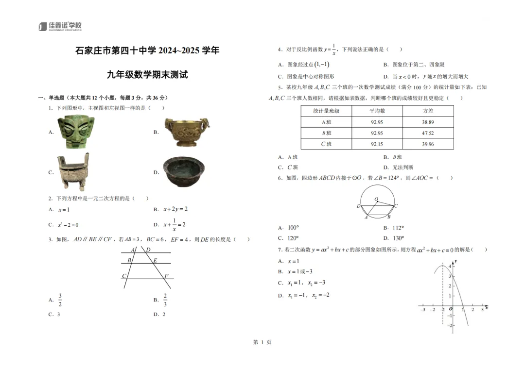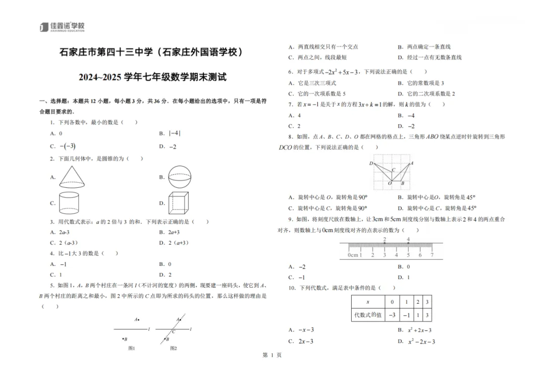 石家庄润德、28中、40中、42中、43中等2024-2025学年12月月考试卷