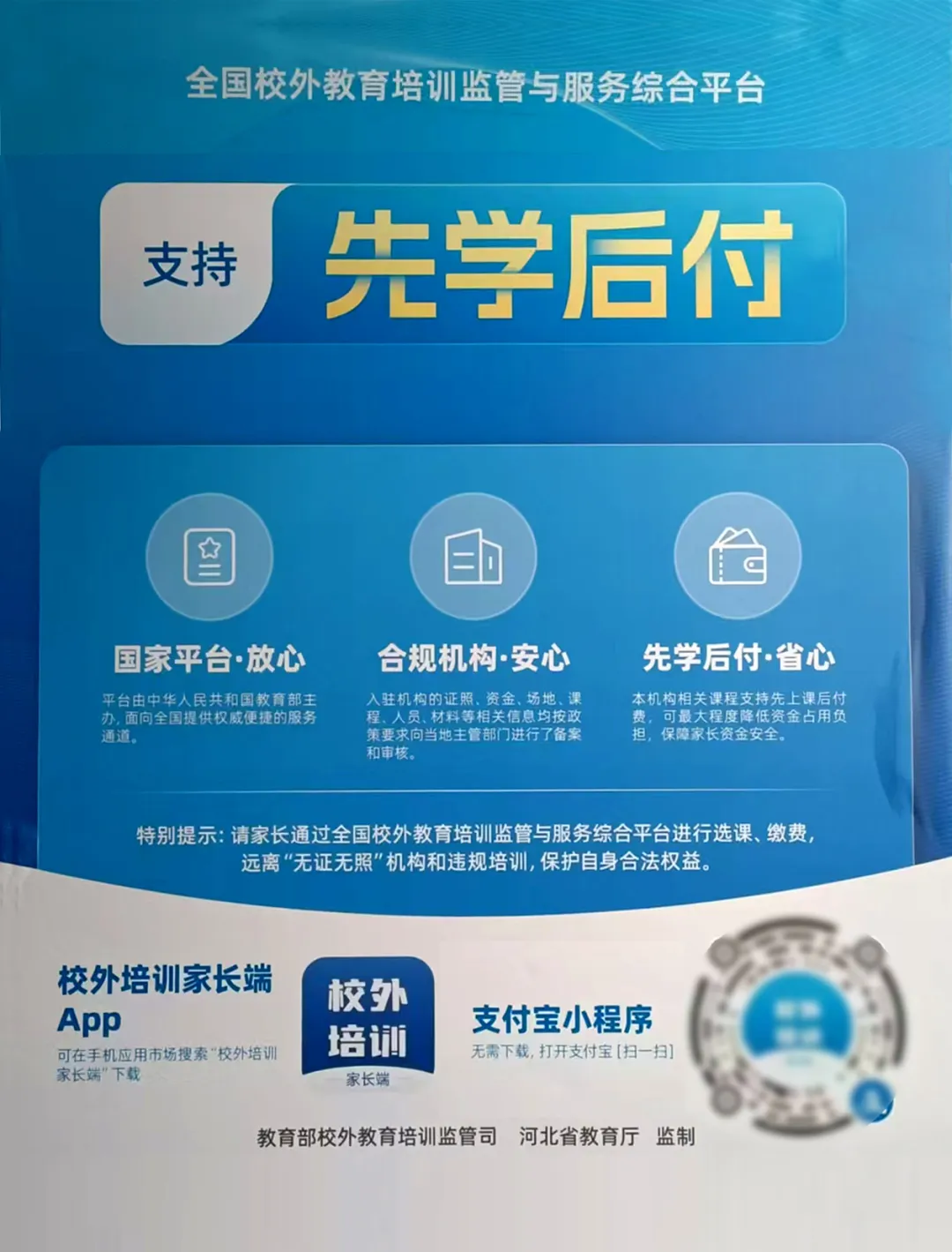 家长如若选择校外培训机构,请选择纳入全国校外教育培训监管与服务综合平台监管的合规机构,其具有《民办学校办学许可证》《营业执照》或《民办非企业单位登记证书》。开展培训前要与校外培训机构签订《中小学生校外培训服务合同(示范文本)》。实施缴费时,鼓励广大家长使用“先学后付”收费模式,不要一次性缴纳或以充值、次卡等形式变相缴纳时间跨度超过3个月或60课时的费用,且不得超过5000元,防范“卷钱跑路”“退费难”发生,保障自身合法权益。