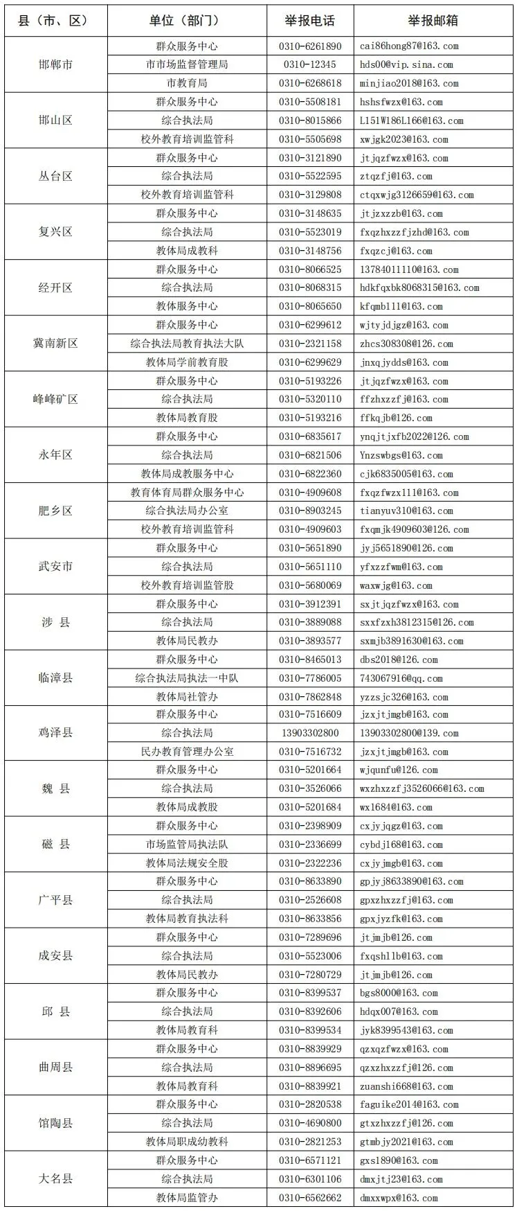 广大家长朋友在为孩子选择培训机构时,务必查看机构消防安全设施设备是否齐全、消防疏散通道是否畅通等。如发现机构存在安全隐患,开展违规培训等问题,可通过邯郸市各县(市、区)投诉举报电话、邮箱和二维码(附后)等渠道,举报问题线索。