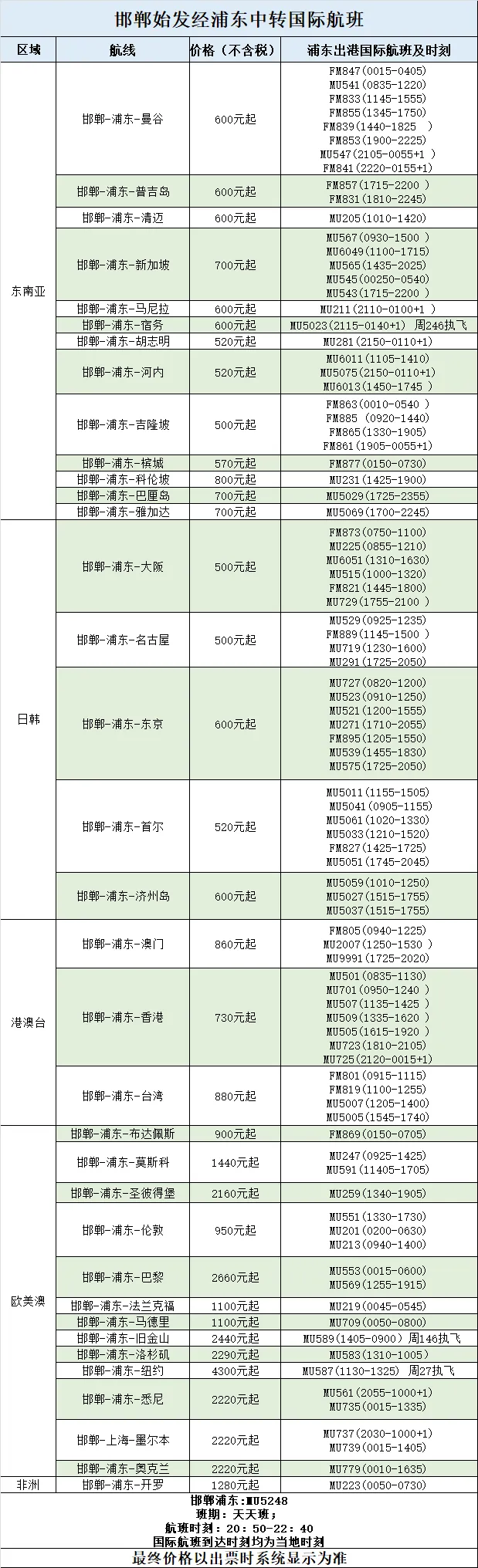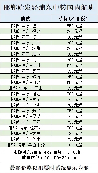 邯郸机场携手东方航空、华夏航空,依托上海浦东机场、呼和浩特机场、大连机场的航线资源优势,推出中转联程飞全国航线产品。