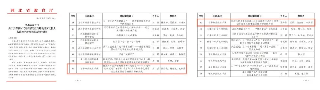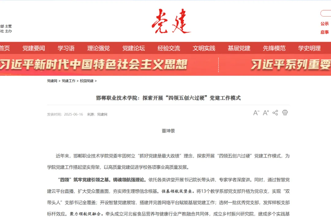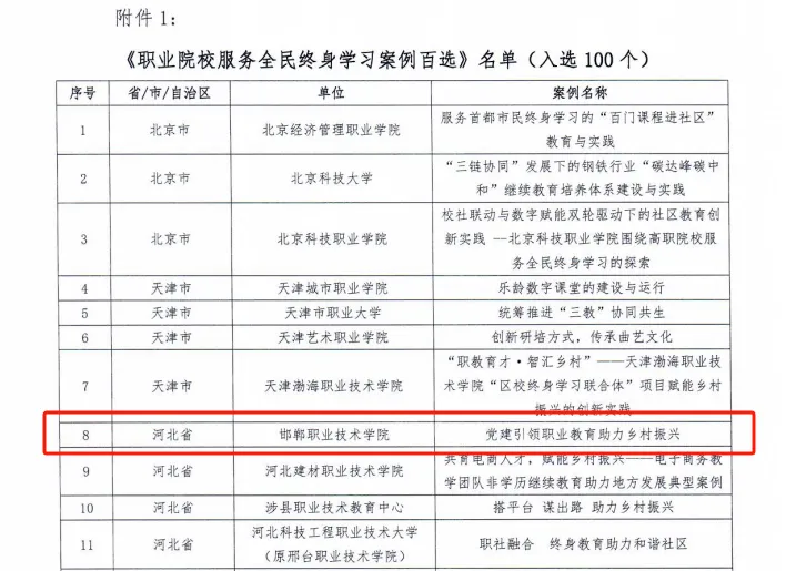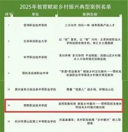 五、乡村振兴工作成绩斐然。服务乡村人才振兴,开展各类培训,培训对象超过5000人次;服务乡村产业振兴,《“智慧农场”应用场景》《发挥职教优势 赋能乡村振兴——邯郸职院多维协同培育乡村振兴新动能》等2个典型案例获国家层面推广;服务乡村组织振兴,《党建引领职业教育助力乡村振兴》获国家典型案例,学院获批邯郸市冀南乡村振兴与区域发展协同创新研究基地,成功当选全国产教融合共同体副理事长单位。