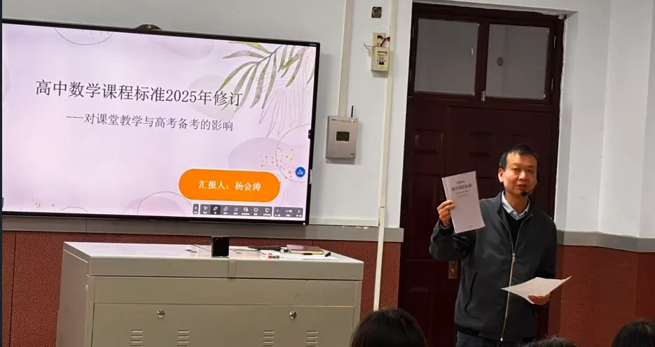 首先,杨会涛主任做了《高中数学课程标准2025年修订——对课堂教学与高考备考的影响》专题报告。报告从课程标准中“了解、理解、掌握”、修订基本情况、修订的主要变化以及2020版与2025版对比变化四个方面展开阐述,向大家详细解读了新课程标准的变化、提出了以数字化赋能数学教育改革、教—学—评”一体化等新理念,突出课程标准的引领作用。
