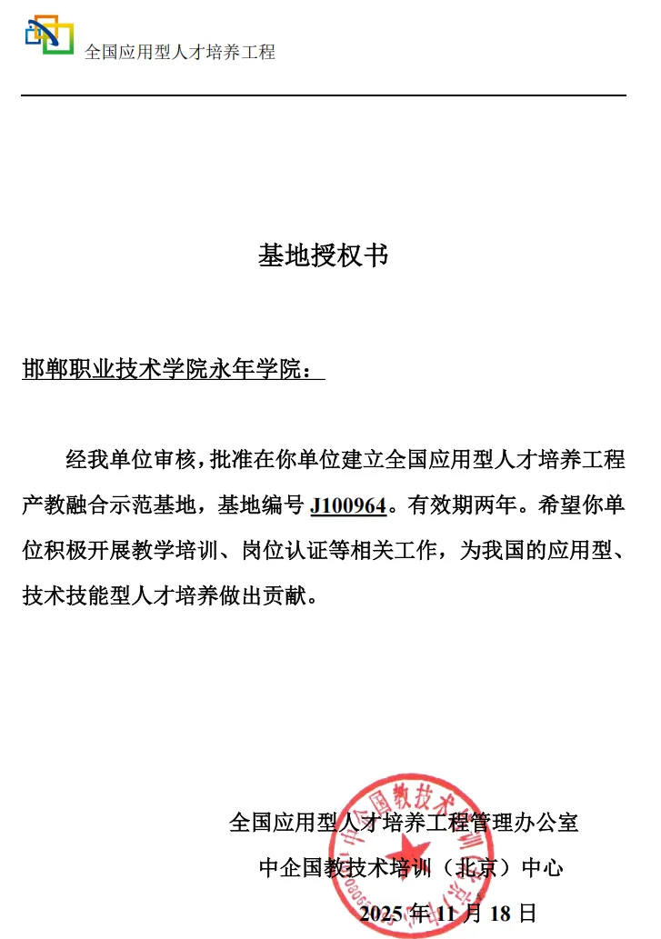 二、获评全国示范基地,人才培养取得新业绩。永年学院入选由教育部高校毕业生就业协会校企合作委员会主办、中企国教技术培训(北京)中心组织实施的全国应用型人才培养工程项目,并获评“全国应用型人才培养工程产教融合示范基地”。