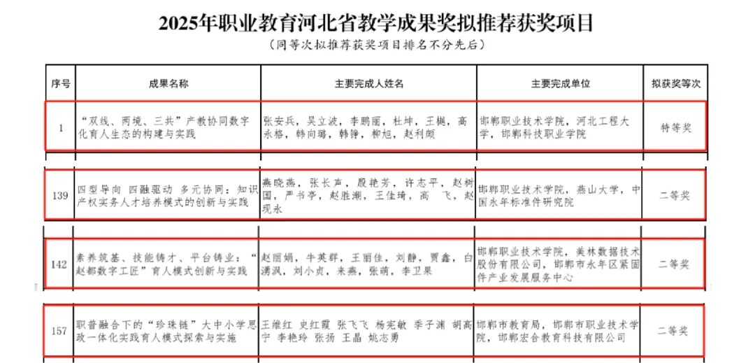 三、荣获省教学成果特等奖,取得历史性新突破。三项省级推荐项目全部获奖:张安兵团队成果《“双线、两境、三共”产教协同数字化育人生态的构建与实践》获2025年河北省教学成果奖特等奖;燕晓燕团队成果《四型导向 四融驱动 多元协同:知识产权实务人才培养模式的创新与实践》、赵丽娟团队成果《素养筑基、技能铸才、平台铸业:“赵都数字工匠”育人模式创新与实践》获河北省教学成果奖二等奖;史红霞团队合作成果《文化基因驱动的“珍珠链”大中小学思政一体化实践育人模式探索与实施》获河北省教学成果奖二等奖。
