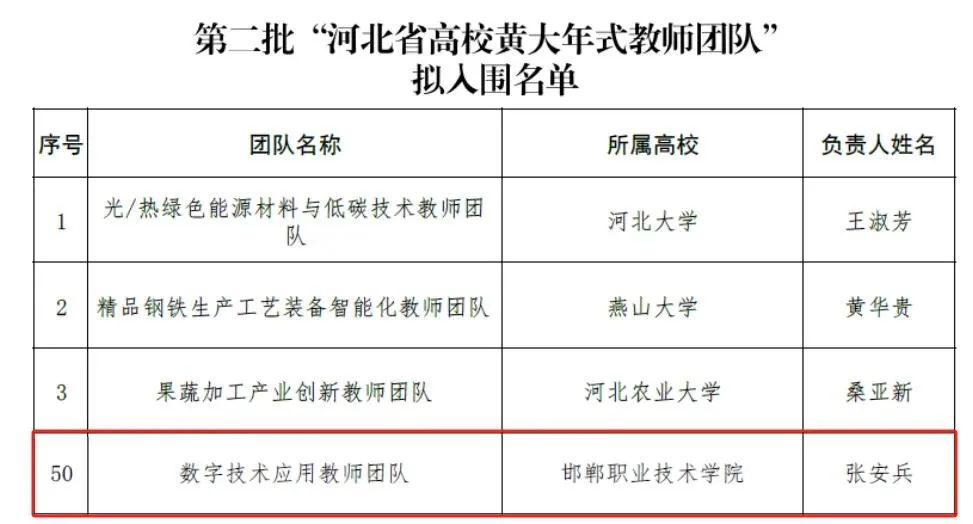 五、荣获河北省第二批黄大年团队,教师团队建设展现新作为。院党委书记张安兵教授领衔的数字技术应用教学团队,获批第二批“河北省高校黄大年式教师团队”,实现学院在该领域“零”的突破。