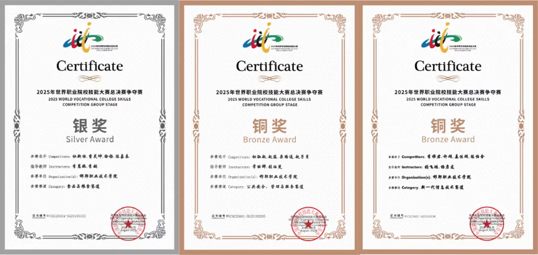 六、世界职业技能大赛斩获奖牌,学生职业技能水平取得新提升。学生在省级以上技能大赛中共获得奖项129项;2025年世界职业院校技能大赛中,学院三个参赛团队均斩获奖项,共获1银2铜。其中食品与生物工程系参加的食品与粮食赛道获银奖,文法系参加的公共安全、管理与服务赛道、数字智能学院参加的新一代信息技术赛道获铜奖。