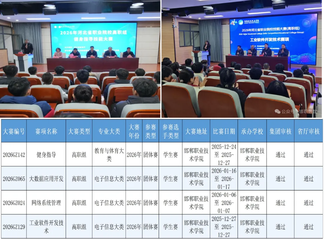 八、省赛承办能力再创新高,赛项数量实现新增长。数字智能学院承办的工业软件开发技术、网络系统管理、大数据应用开发三个赛项,以及运动与健康系承办的健身指导赛项,共4项获得2026年河北省职业院校技能大赛承办资格,其中工业软件开发技术、网络系统管理两项为首次承办,实现办赛赛项新突破。