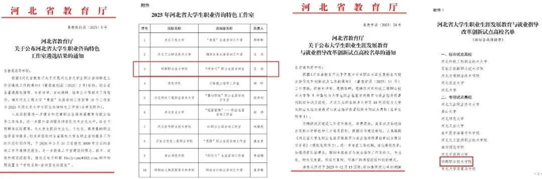 十、入选河北省改革创新试点高校,职业生涯规划工作取得新亮点。创新创业教研室王伟主持的“伴你行”职业生涯咨询室,以总排名第三、高职院校第一的优异成绩,被认定为2025年河北省大学生职业咨询特色工作室,实现学院在该领域“零”的突破;此外,教研室主持申报的河北省大学生职业生涯发展教育与就业指导改革创新试点高校项目成功入选,在全省131所高校(含63所本科、68所高职)中跻身前15名,成功迈入本次试点高校第一梯队。