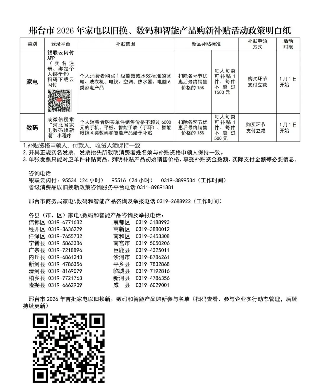 邢台市2026年家电以旧换新、数码和智能产品购新补贴活动政策明白纸