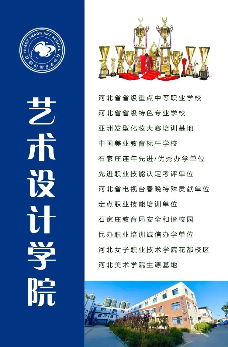 石家庄花都形象艺术学校(石家庄市花都技工学校)始建于1994年,是经上级政府部门批准的全日制中等职业学校,隶属于花都教育集团。学校秉承“尚德、至善、存真、尚美”的校训,坚持升学、就业两手抓,以满足学生职业需求为导向,大力推进“提质培优、质量立校、专业塑校、管理强校”的战略。经历30年发展,已形成升学与就业并重、学历教育与短期培训相结合的办学体系,铸就了传统特色专业+现代骨干专业+技能大赛的人才培养模式,构建以对口升学、艺体升学、单招升学为主的升学渠道,催生出丰厚的办学成果。