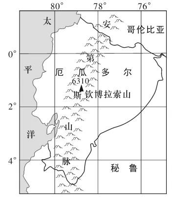 火山是火山喷发形成的,通常由突出的火山锥(陡缓与岩浆黏稠度相关)和下凹的火山口组成。厄瓜多尔的钦博拉索山(位置如下图)是世界上最高的火山之一,山体四周发育了10多条冰川。世界上海拔超过6000米的火山有34座,有33座集中在钦博拉索山所在的山脉。