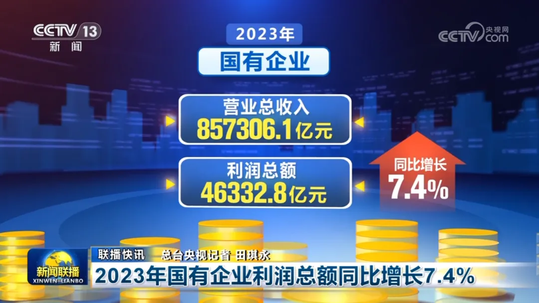 ◎财政部1月29日公布2023年全国国有企业经济运行情况。2023年,国有企业营业总收入857306.1亿元,利润总额46332.8亿元,同比增长7.4%。国有企业主要效益指标继续稳步增长,回升向好态势进一步巩固。