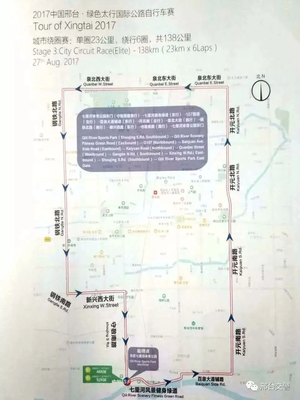 5、公安交通管理部门将根据现场活动情况视情提前或推迟交通管制时间,扩大或缩小交通管制范围,并分时段采取交通管制措施。敬请广大市民积极配合公安交通管理部门工作,根据交通管制通告提前选择出行路线,以免影响工作和生活。8月27日国际组城市绕圈赛期间,离开邢台市区的机动车、非机动车和行人,可经新华南路南行、百泉大道桥北口右转西行及百泉大道新华南路桥辅道通行,进入邢台市区的机动车、非机动车和行人,可走东华路经百泉大道西行、新华南路出口右转北行。