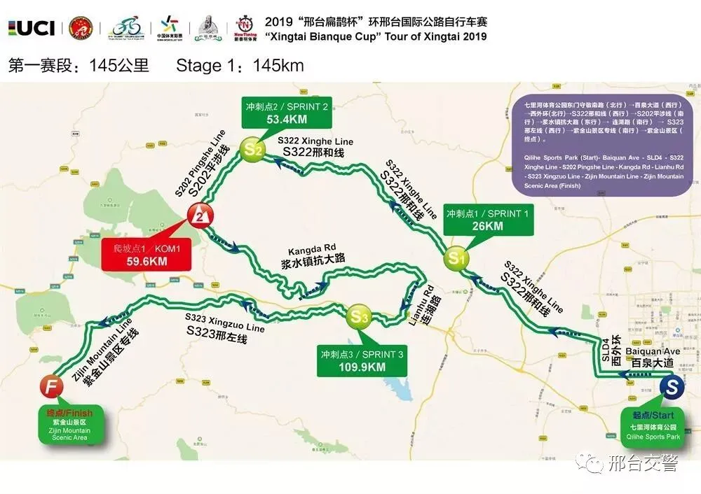 比赛路线:七里河体育公园东门→守敬南路→百泉大道→西外环→S322邢和线→S202平涉线→抗大路→连湖路→S323邢左线→紫金山景区专线→紫金山景区(终点)。