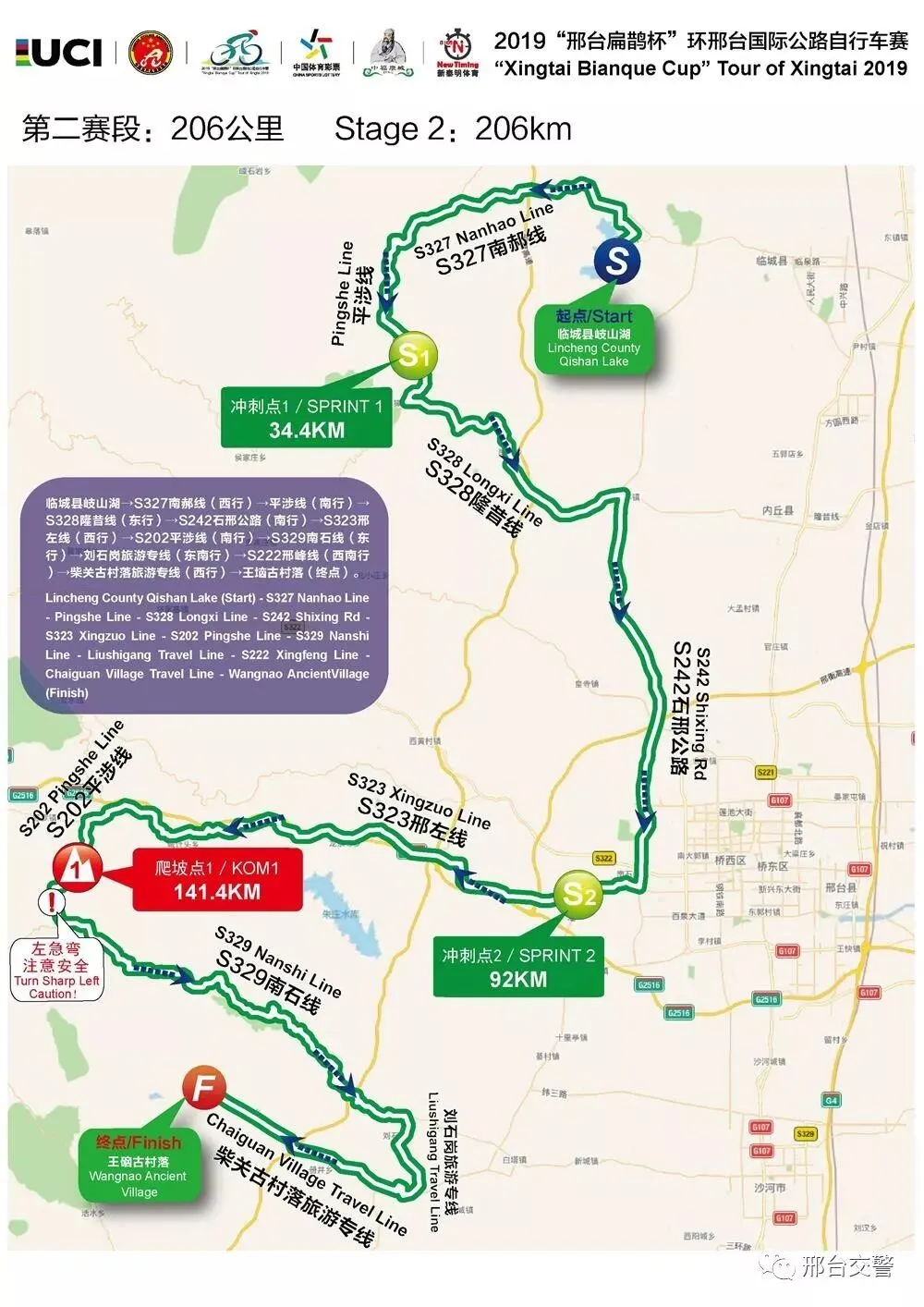 比赛路线:临城县岐山湖→S327南郝线→S202平涉线→S328隆昔线→S242石邢公路→S323邢左线→S202平涉线→S329南石线→刘石岗旅游专线→S222邢峰线→栾卸银杏生态村→柴关古村落旅游专线→王硇古村落(终点)。