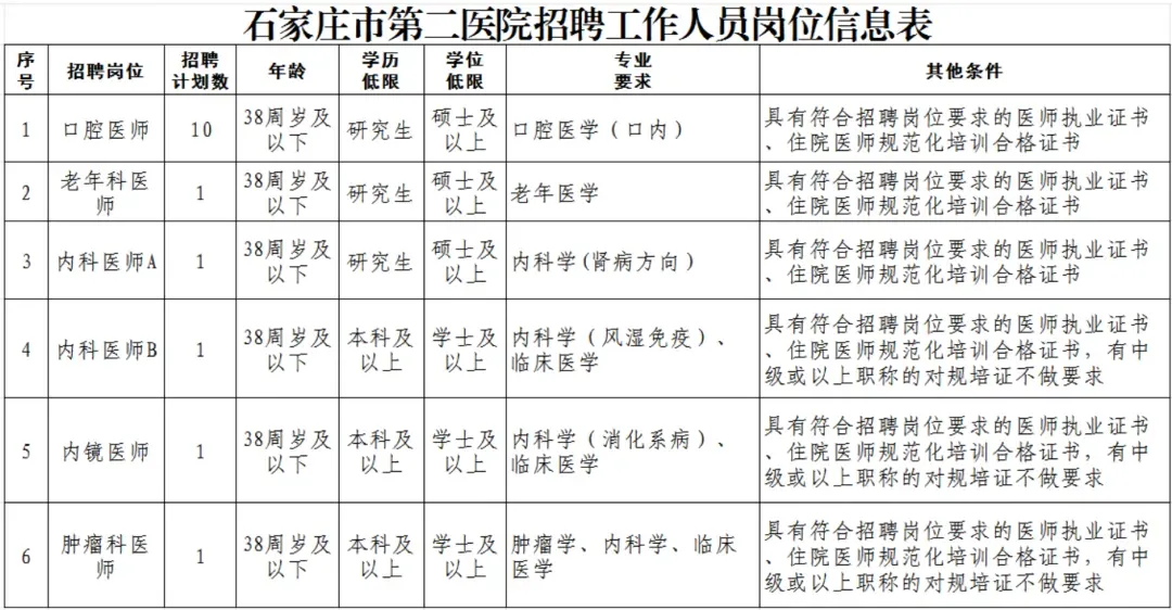 石家庄市第二医院补招15名工作人员的通知