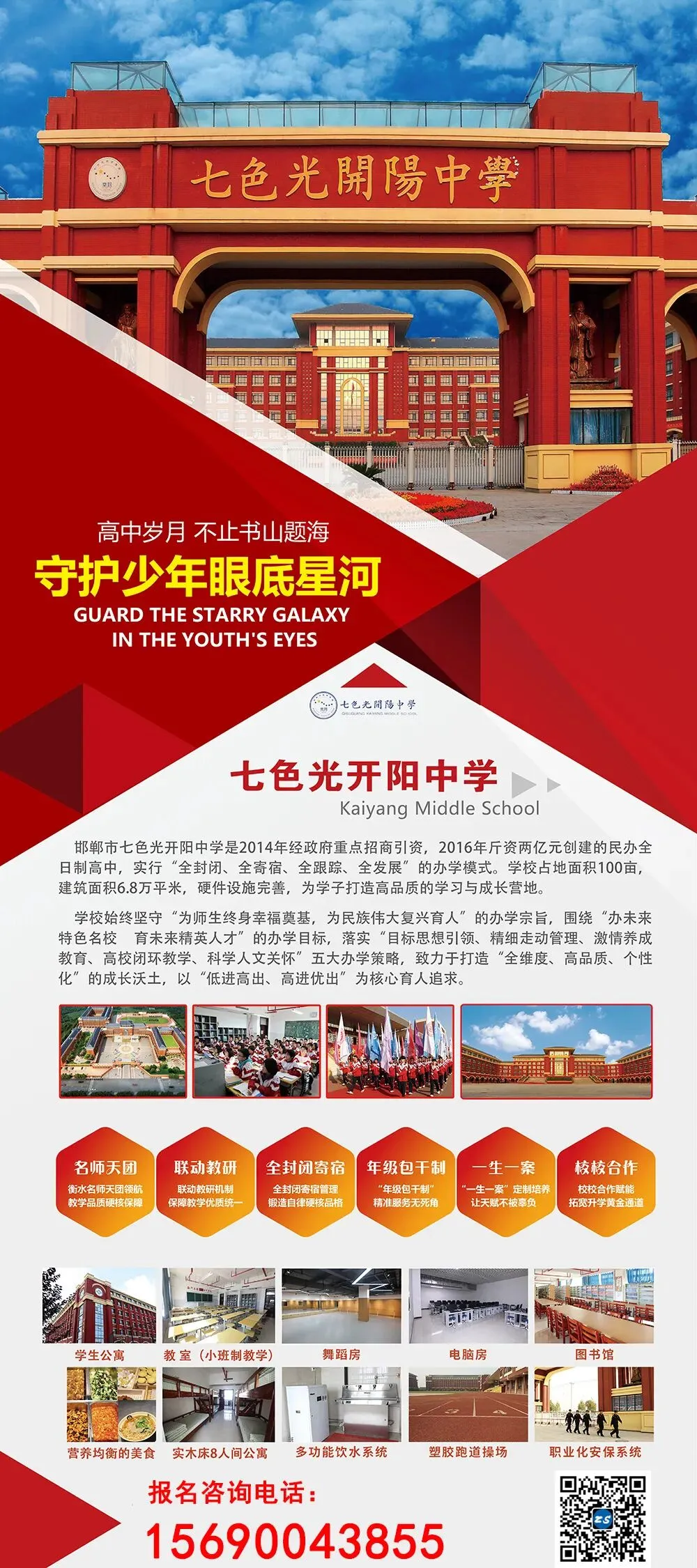 邯郸市七色光开阳中学是2014年经政府重点招商引资,2016年斤资两亿元创建的民办全日制高中,实行“全封闭、全寄宿、全跟踪、全发展”的办学模式。学校占地面积100亩,建筑面积6.8万平米,硬件设施完善,为学子打造高品质的学习与成长营地。