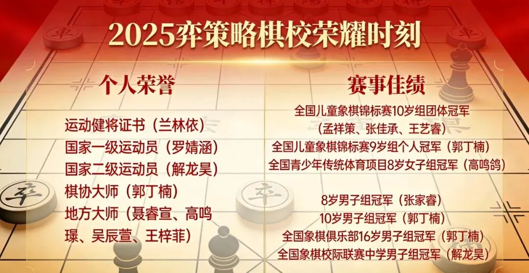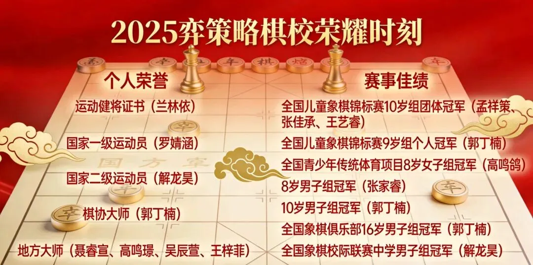 回望2025,棋校健儿锋芒尽显,捷报频传:兰林依斩获运动健将证书,罗婧涵、解龙昊分别荣膺国家一级、二级运动员称号;郭丁楠晋升棋协大师,聂睿宣、高鸣璟、吴辰萱、王梓菲四位小将顺利晋级地方大师。