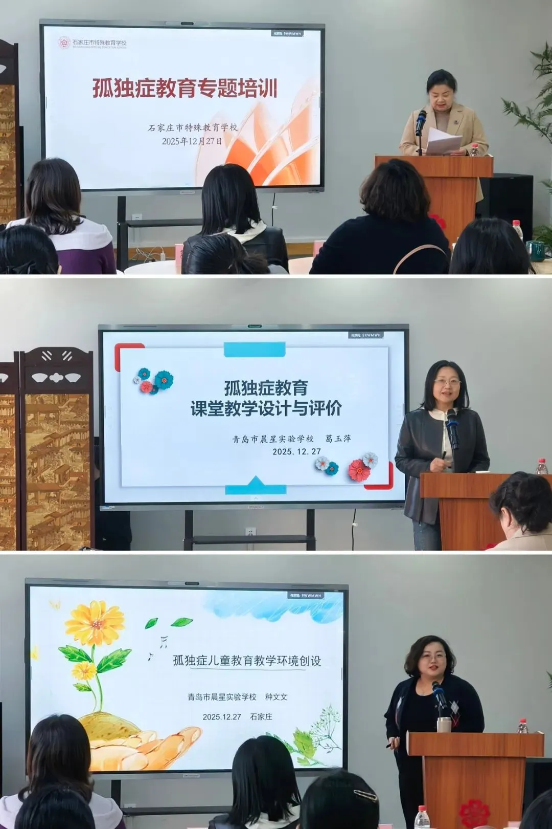返校后,学校特邀重庆师范大学教育科学学院特殊教育系主任魏寿洪、青岛市晨星实验学校副校长葛玉萍、教务处主任种文文开展专题讲座。三位专家分别围绕课堂教学设计、教育教学环境创设、孤独症教育康复策略等主题展开系统讲解,内容兼具理论高度与实践深度,有效拓宽了参训教师的专业视野,提升了教学实施能力。