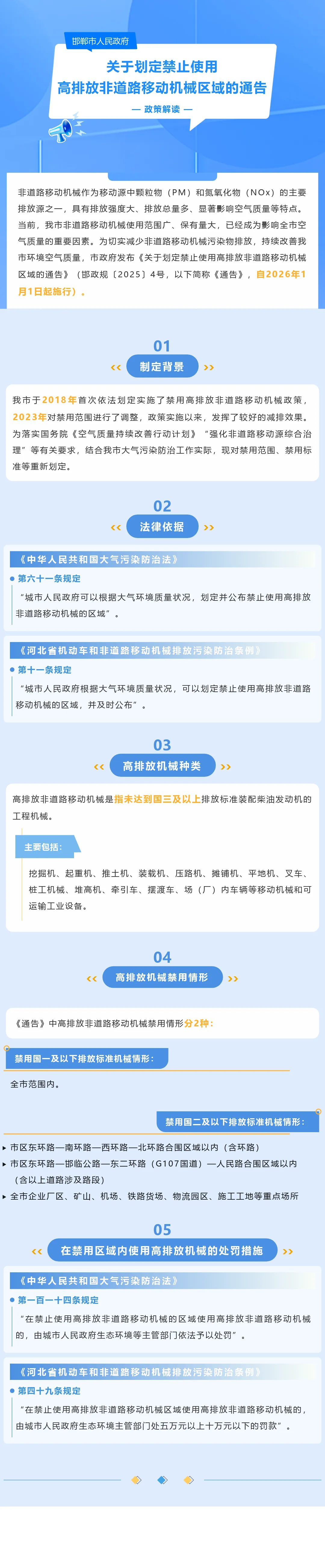 为进一步减少非道路移动机械污染物排放,持续改善邯郸市环境空气质量,根据《中华人民共和国大气污染防治法》《河北省机动车和非道路移动机械排放污染防治条例》等有关规定,市政府决定在邯郸市划定禁止使用高排放非道路移动机械区域(以下简称禁用区)。现将有关事项通告如下。
