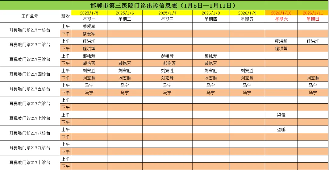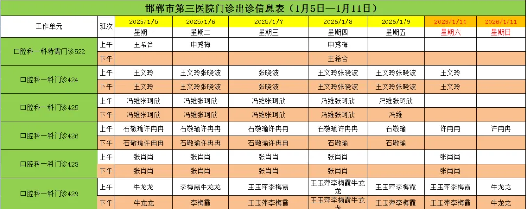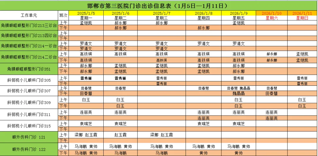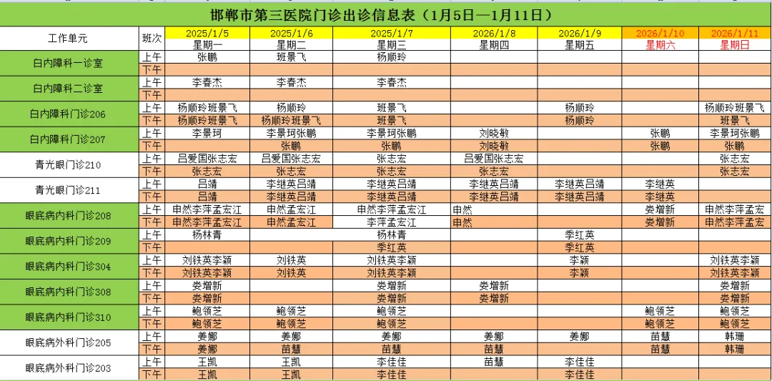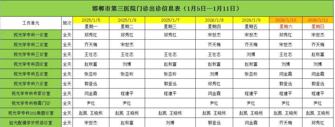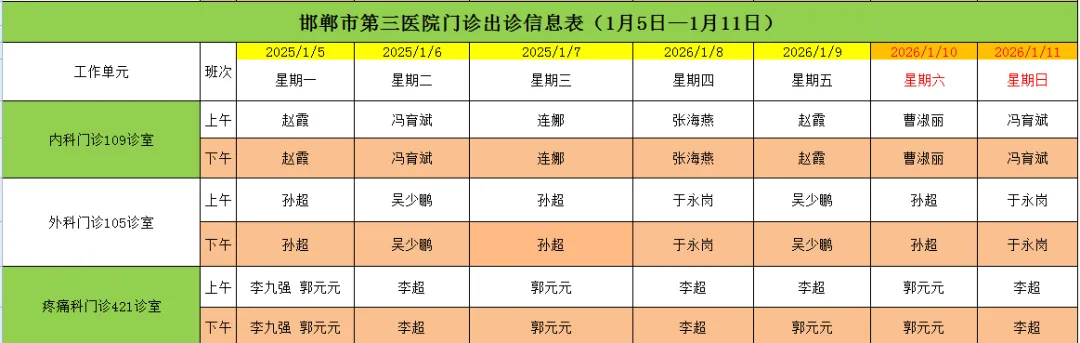 邯郸市第三医院(2026年1月5日—2026年1月11日)门诊出诊信息