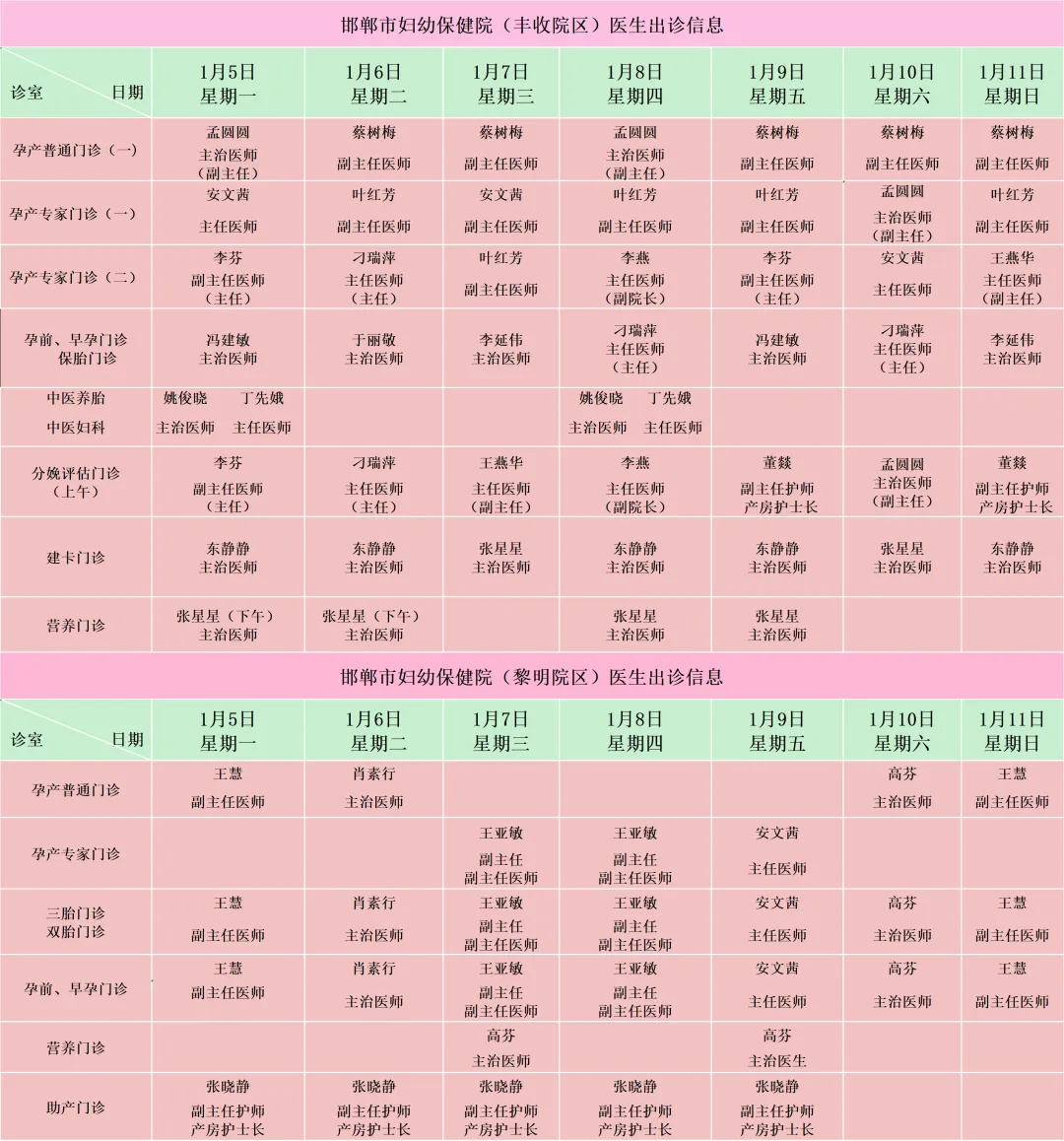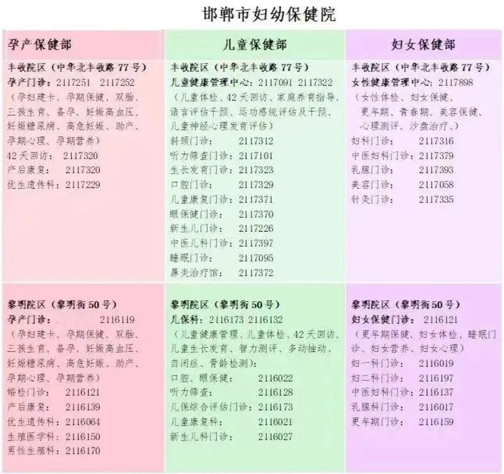 邯郸妇幼产科门诊、孕产专家门诊、特色门诊出诊一览表
