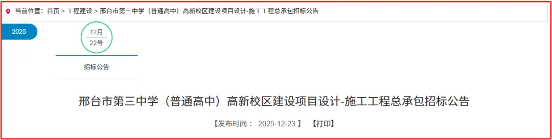 本招标项目邢台市第三中学(普通高中)高新校区建设项目设计-施工工程总承包(项目名称)已由河北邢台高新技术产业开发区(邢东新区)行政审批局(项目审批、核准或备案机关名称)以邢台高新区行政审批局关于邢台市第三中学(普通高中)高新校区建设项目初步设计的批复(邢东新批投资[2025]82号)(批文名称及编号)批准建设,项目业主为河北邢台高新技术产业开发区(邢东新区)社会事务局,建设资金来自财政资金(资金来源),项目出资比例为100%,招标人为河北邢台高新技术产业开发区(邢东新区)社会事务局。