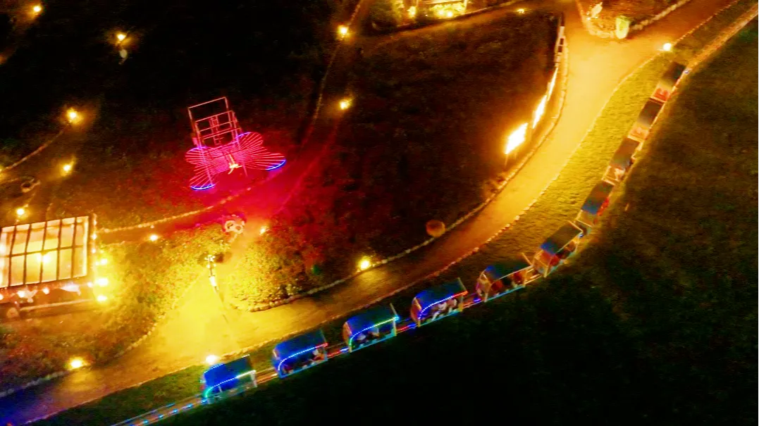 坐上环园小火车,3公里路程、25分钟的漫游,让你从不同角度饱览花灯盛景,晚风拂面间尽是惬意。