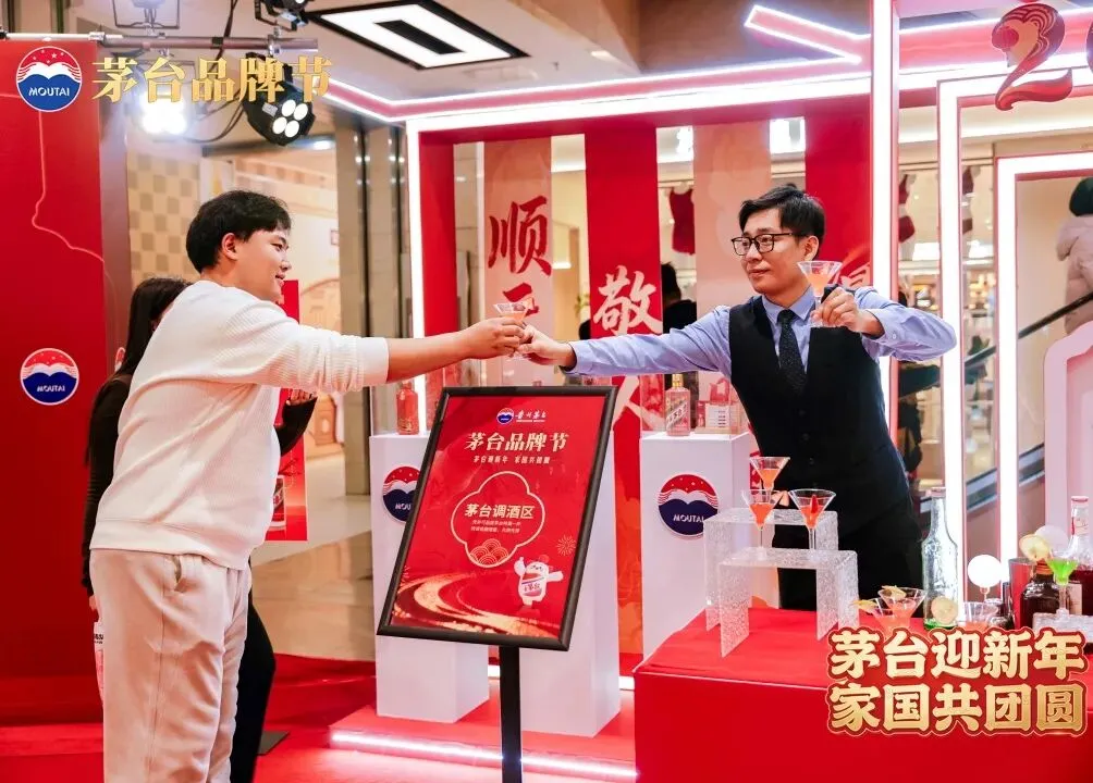 与之呼应,北国商城展区内,小茅玩偶与“财神”巡游队伍所到之处,欢声笑语汇成海洋,大家追逐着派发非遗拓印红包的吉祥物。创意调饮区内,调酒师以茅台为基创作味觉艺术品;互动祈福区的转盘承载着新年期盼;艺术茅台酒瓶在灯光映照下,成为连接古典与现代的视觉焦点。