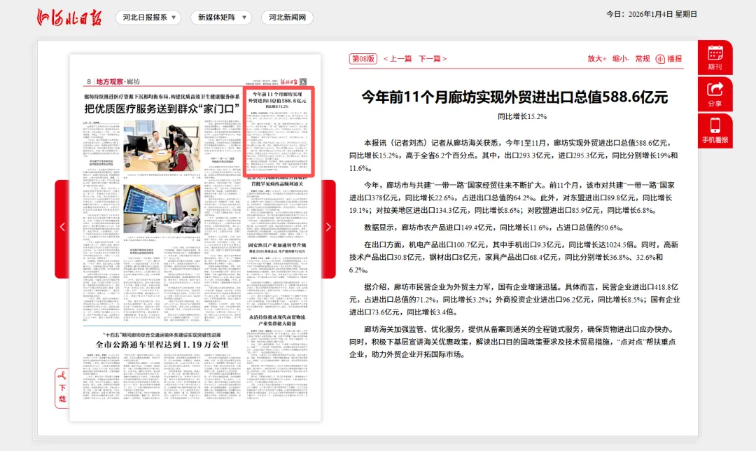 今年前11个月廊坊实现外贸进出口总值588.6亿元