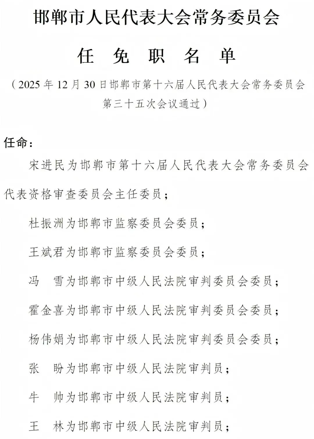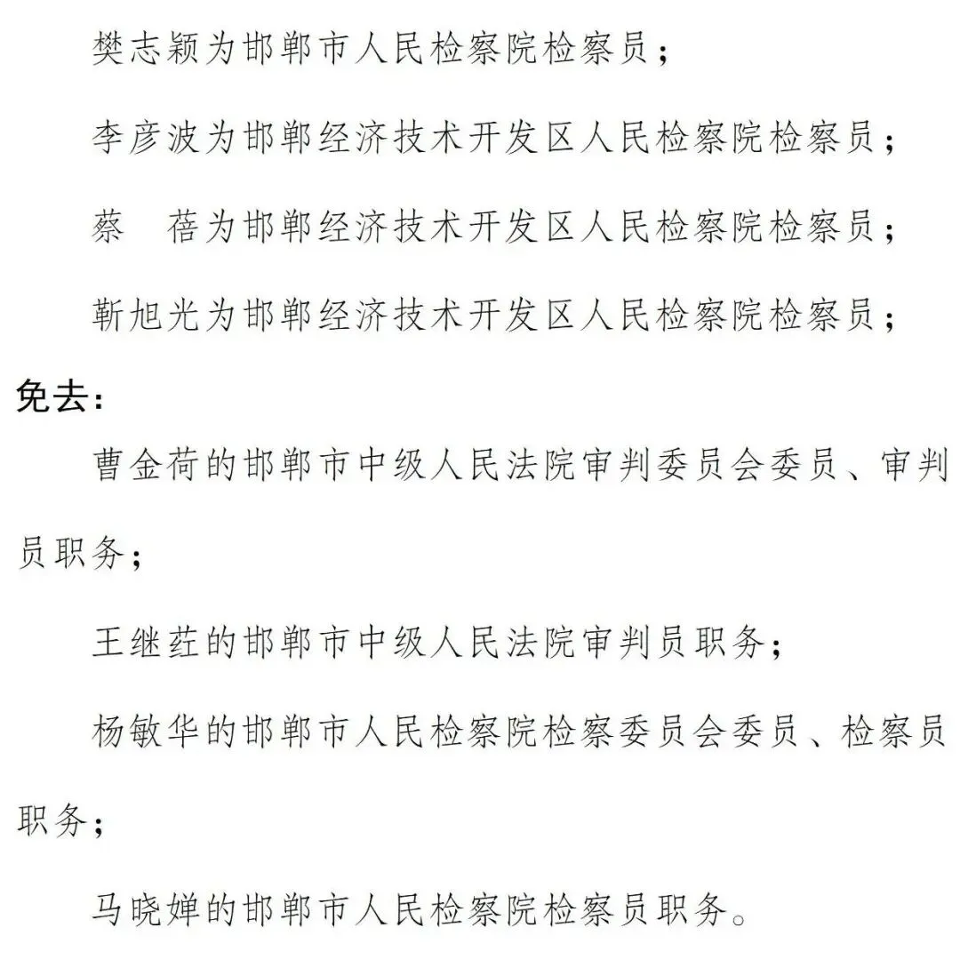>邯郸市人民代表大会常务委员会任免职名单