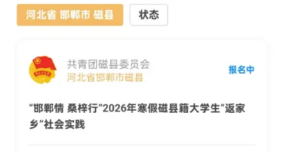 为深入学习贯彻习近平新时代中国特色社会主义思想,引导磁县籍大学生在投身磁县乡村振兴等工作过程中实现人生价值,促进磁县籍大学生在了解家乡发展变化、参与家乡基层工作、推动学校与家乡合作过程中增长才干,团县委现面向全国高校,选拔一批优秀磁县籍在校大学生,开展2026年寒假磁县籍大学生“返家乡”社会实践活动。