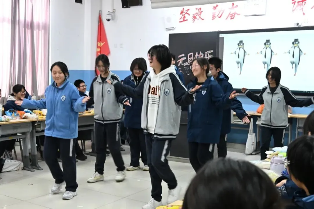 联欢现场,青春的光芒尽情闪耀:幽默诙谐的小品将新年喜悦演绎得淋漓尽致,掌声与笑声此起彼伏;清澈悠扬的歌声唱出对未来的憧憬,句句动人、声声入心;活力四射的舞蹈随着节奏跃动,绽放着青春的蓬勃朝气,瞬间点燃全场热情。各班还精心准备了趣味游戏、幸运抽奖等互动环节,一张张照片定格了灿烂的笑容,不仅记录下同学们的飞扬神采,更凝聚了班级的向心力,传递出二中校园特有的融融暖意。