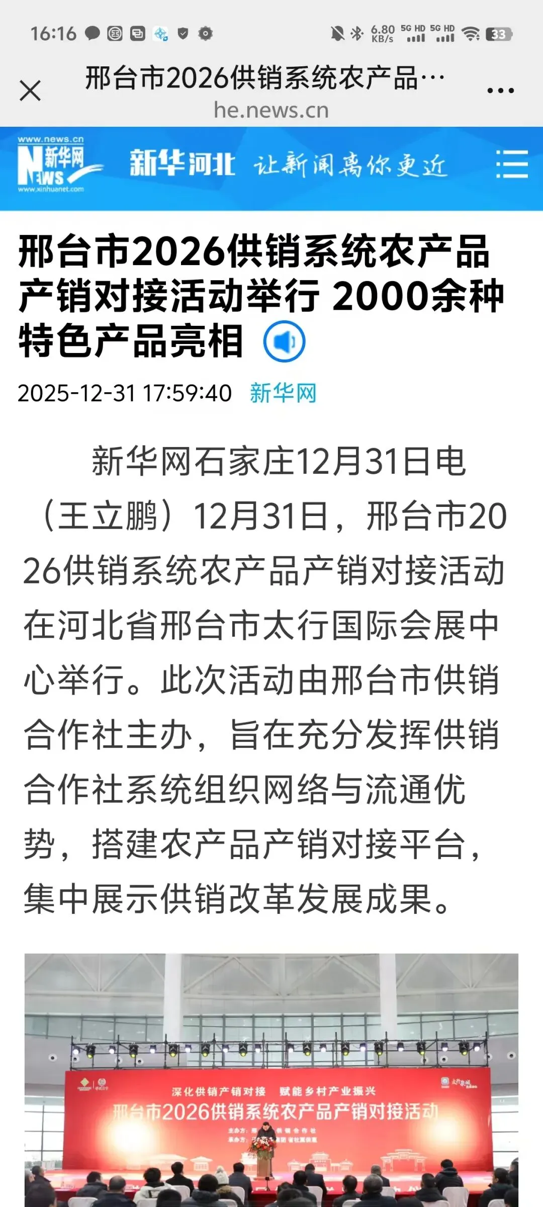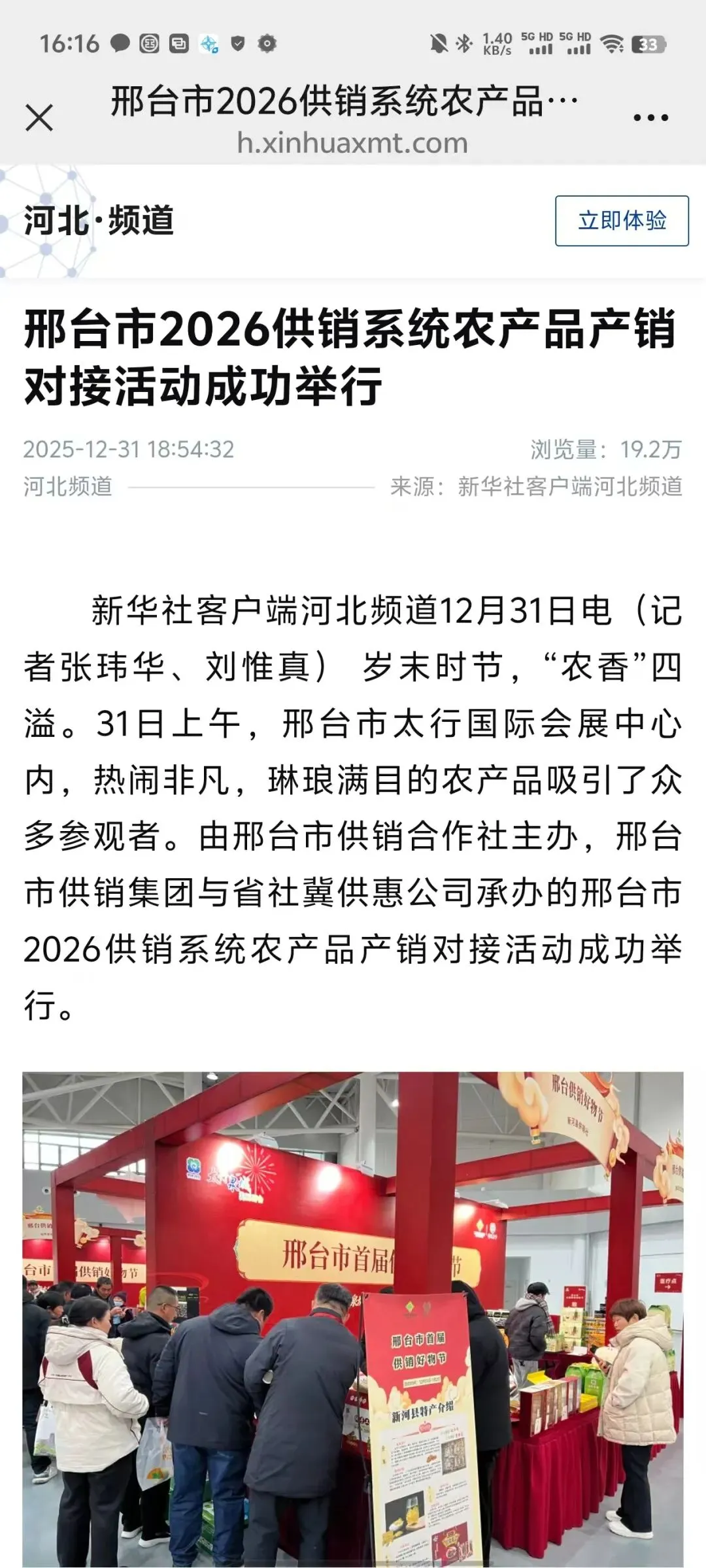 近日,邢台市2026供销系统农产品产销对接活动在邢台市太行国际会展中心成功举行,被多家媒体广泛报道,反响热烈。新华社、新华网、中华合作时报、邢台日报等各级媒体予以报道,为全力加快供销事业高质量发展提供了强大精神力量和舆论支持。