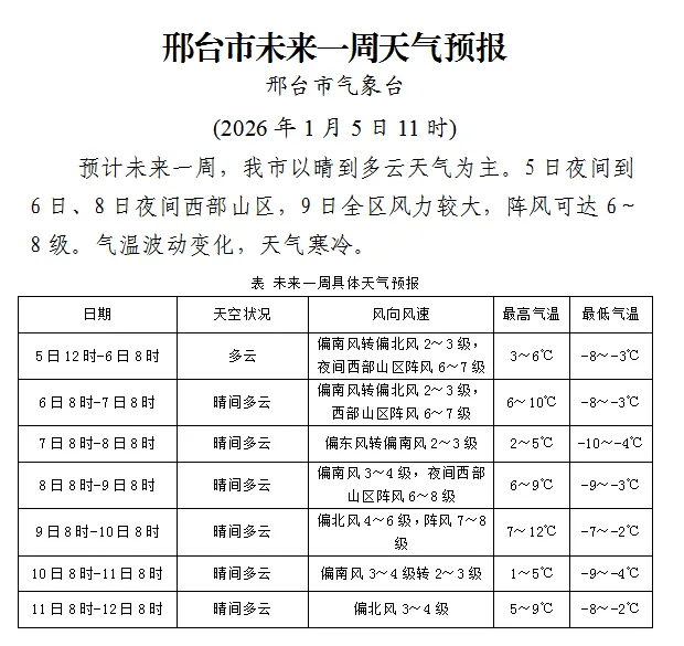 邢台市气象台2026年1月5日15时23分发布大风蓝色预警信号:预计5日夜间到6日夜间,我市西部(信都、临城、内丘)山区有西北风4~5级,阵风6~8级。请注意防范。