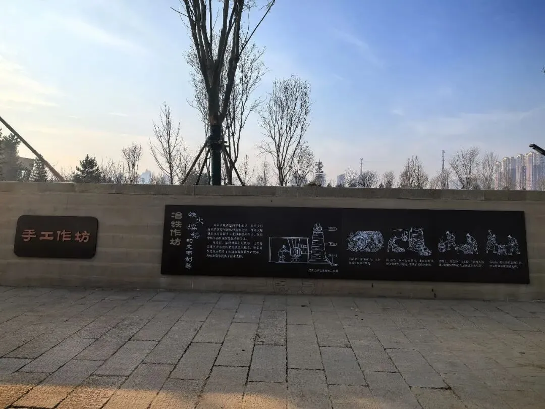 在这座公园里,还通过图文并茂的形式,展现了那个时代冶铁作坊、铸钱作坊、手工作坊等作坊劳作的场景。当然,我们还看到了仿制的写有“真定长乐”“富昌长乐”的文字瓦当。正是这些文字瓦当的出土,为东垣古城是两汉真定国国都的性质判定提供了明确依据。