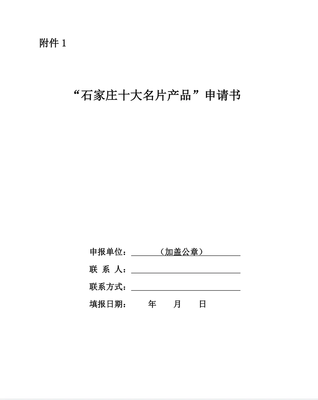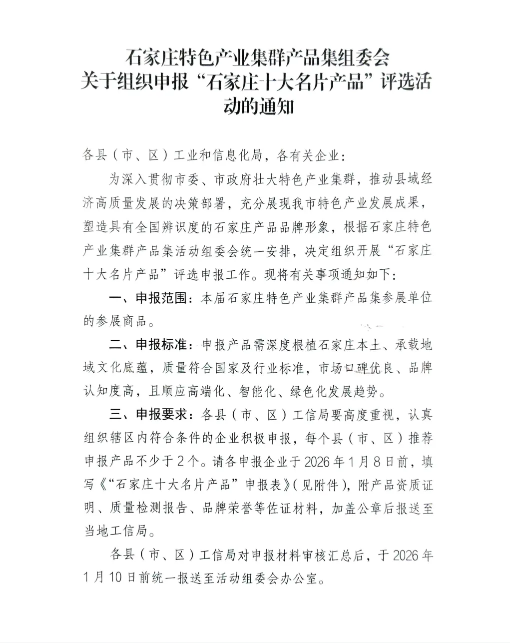 >重要通知——石家庄特色产业集群组委关于组织申报“石家庄十大名片产品”评选活动的通知