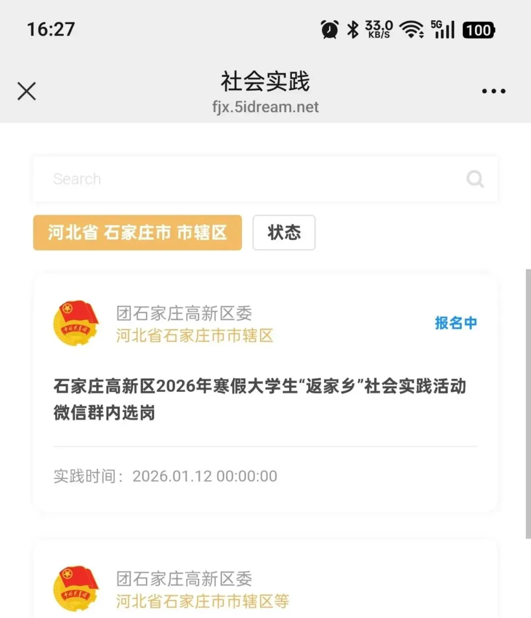 石家庄高新区2026年寒假大学生“返家乡”社会实践活动等你来参加~1.高新区籍或常住高新区的全日制本(专)科及以上在读大学生和应届毕业生;2.符合实践单位招募条件,政治思想、组织纪律观念强,道德良好、品行端正、身体健康、综合素质较高,无违法违纪等不良记录;3.在校期间积极参加党团组织活动,中共党员、预备党员、优秀共青团员、优秀学生干部、青年志愿者优先列入选拔对象;4.本人自愿参加实践活动,并征得学校和家长同意,能全程按要求参与“返家乡”活动。1.政企实践。走进地方党政机关、事业单位、重点企业,承担活动组织、工作宣传、文字编辑、日常事务等工作,在政务服务一线等方面积极发挥作用。2.基层实践。向村(社区)报到,在镇办团委和村(社区)团组织的统一指挥下,就近就便编入志愿者组织、青年突击队等,协助参加基层综合治理。2026年1月至2月,实践时间原则上不少于15个工作日。(根据参加人员个人情况、工作情况以及单位具体要求实际调整)1.参与实践的大学生要严格遵守所在单位规章纪律、杜绝迟到早退现象。2.本次实践活动为志愿服务形式,实践期间无工资、无补助发放,因工作产生的费用按照相关规定由用人单位实报实销。3.申报岗位者均需在用人单位所在辖区居住,不建议跨区域参与社会实践。4.录用后不得无故不上岗。对无故不上岗的学生,共青团石家庄高新区委将列入全区各级团组织社会实践黑名单。在“社会实践”选择“2025三下乡”后选择“返家乡”。选择“注册账号”(之前登录过返家乡的小伙伴直接登录就可以哦~),根据提示填写本人信息完成注册;注册完成后,点击选择“返家乡项目”后选择“岗位列表”;点击“区域筛选”,依次选择