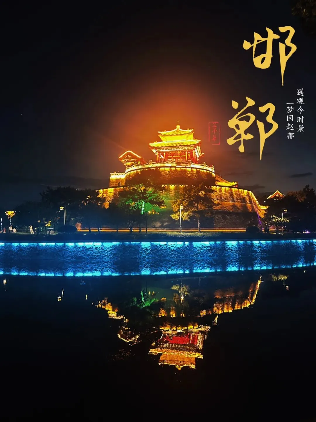 如果说邯郸的历史是一卷厚重的书,那丛台公园一定是最亮眼的那一页。夜幕降临,滏阳河畔的武灵丛台被灯火点亮,金瓦红墙映在水中,恍惚间,仿佛穿越回两千多年前的赵都盛景。