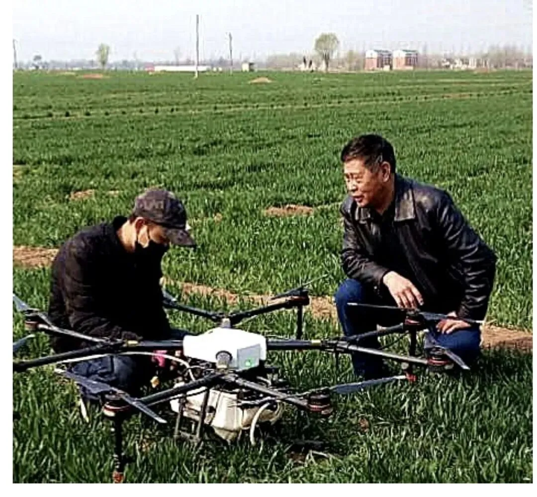 (图为唐健全(右)在魏县边马乡指导农技人员操作无人机田间喷洒农药。)