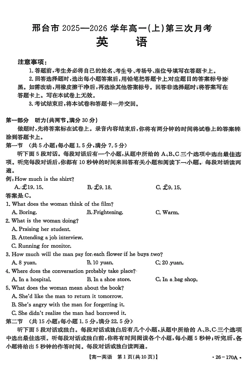点击关注,后台发送信息【河北省邢台市联考2025-2026学年高一上学期12月月考英语试题】领完整版试卷和解析!