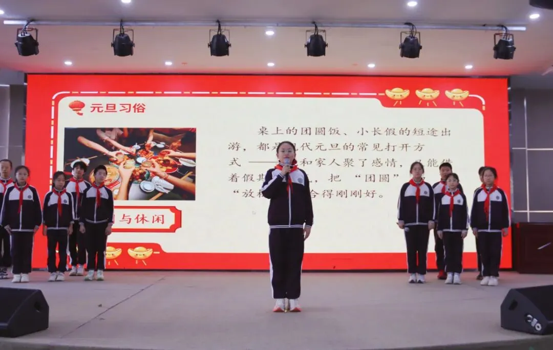 六(3)中队的队员们化身“文化小讲师”,带领师生共同追溯元旦的历史源流:从《尚书》的古老记载到汉代岁首的正式确立,从唐宋朝会的盛世景象到现代丰富多彩的新年习俗。在生动的讲述中,师生更深刻感悟到“一元复始,万象更新”背后蕴含的中华文化智慧和美好寓意。