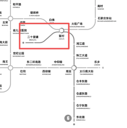 二十里铺站~留村站区间是6号线一个较为特殊的区间。它在裕华路上与既有1号线处于并行状态,也就是说6号线的两条隧道分别位于1号线两条隧道的外侧。将来,1、6号线将在留村站实现“同站台换乘”。