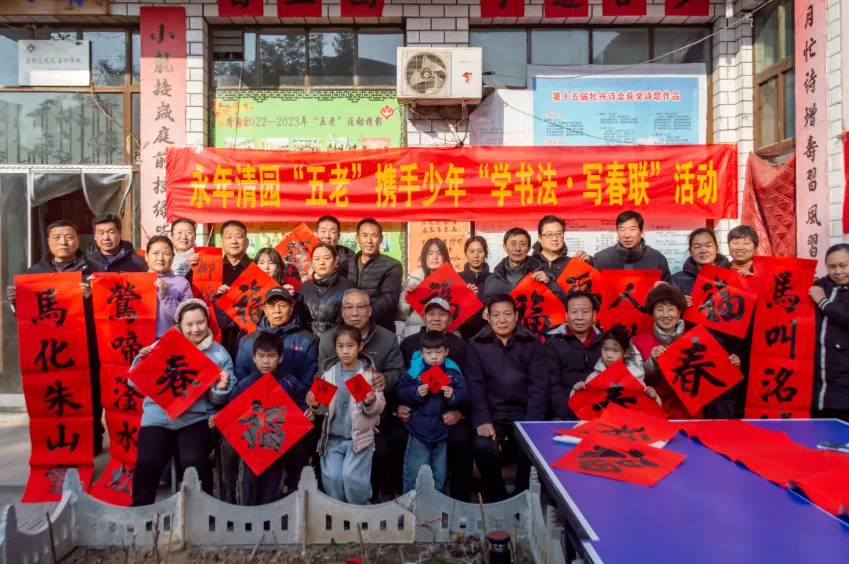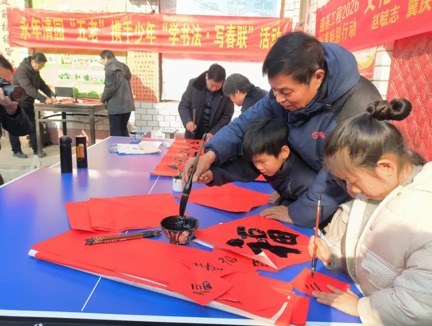 1月3日下午,邯郸市永年区清园五老传红阵地内洋溢着欢声笑语,“五老”与青少年携手开展“学书法•写春联”主题活动,十余位“五老”成员与志愿者挥毫泼墨创作新春楹联,青少年在浓厚兴趣中提笔临摹,用心书写出一个个充满童趣的“春”“福”字样。