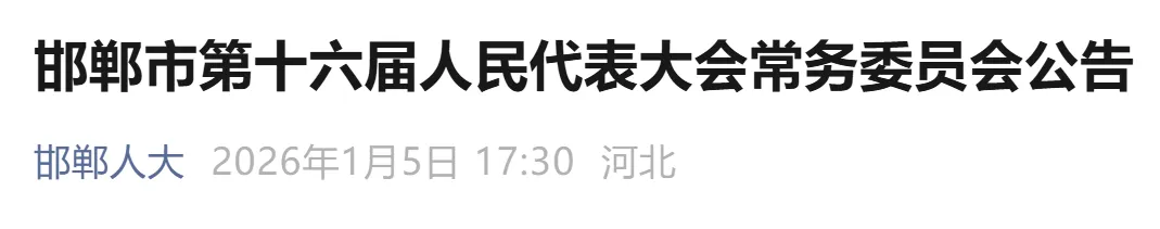 1月5日17:30,官微“邯郸人大”发布《邯郸市第十六届人民代表大会常务委员会公告》披露:邯郸市第十六届人民代表大会常务委员会第三十五次会议决定任命:于波为邯郸市人民政府副市长。
