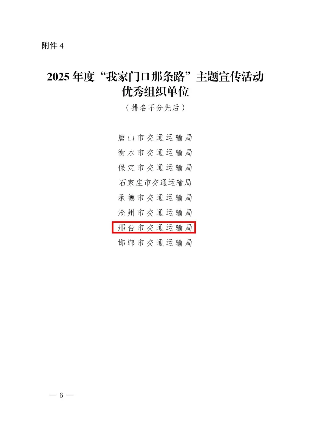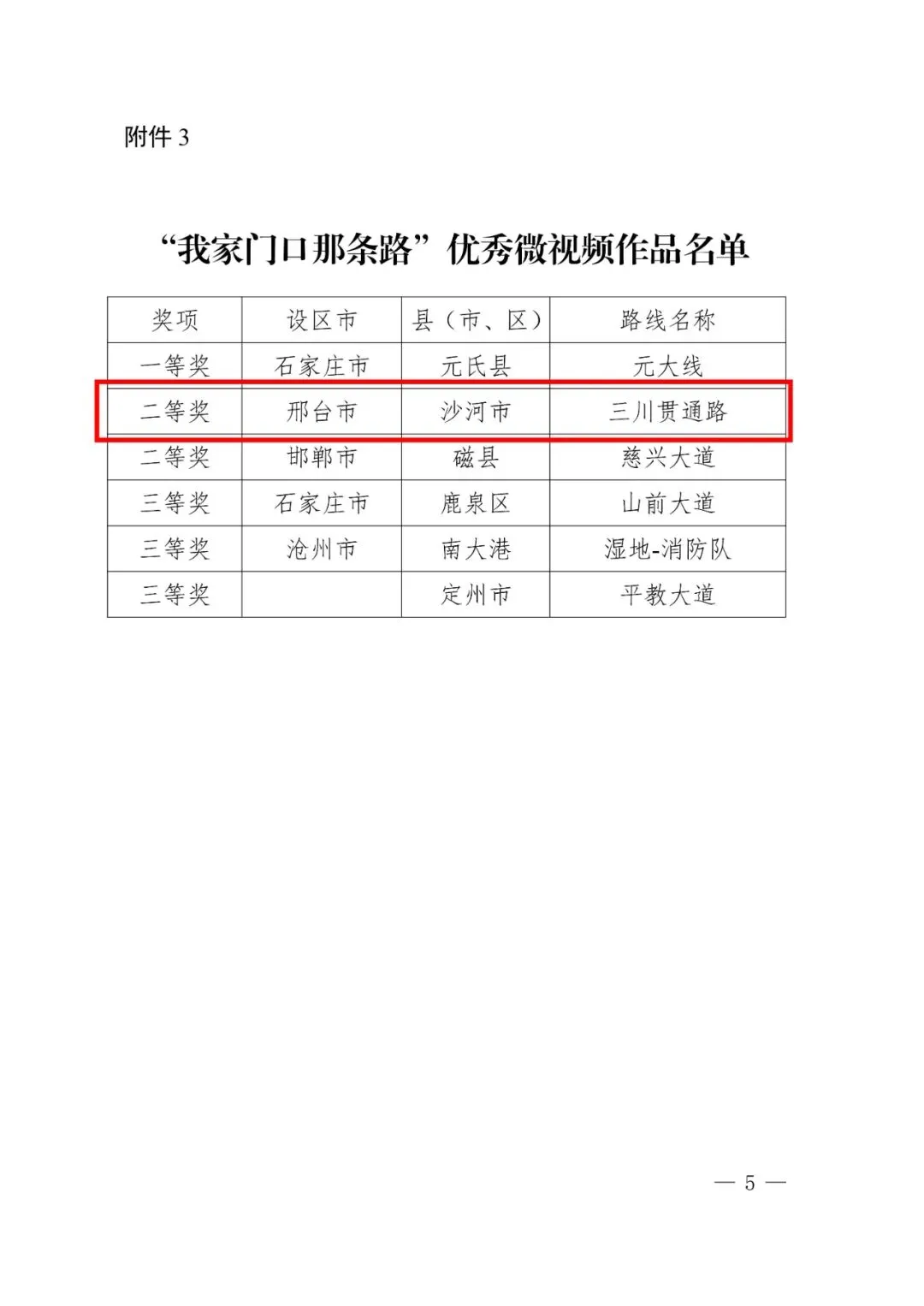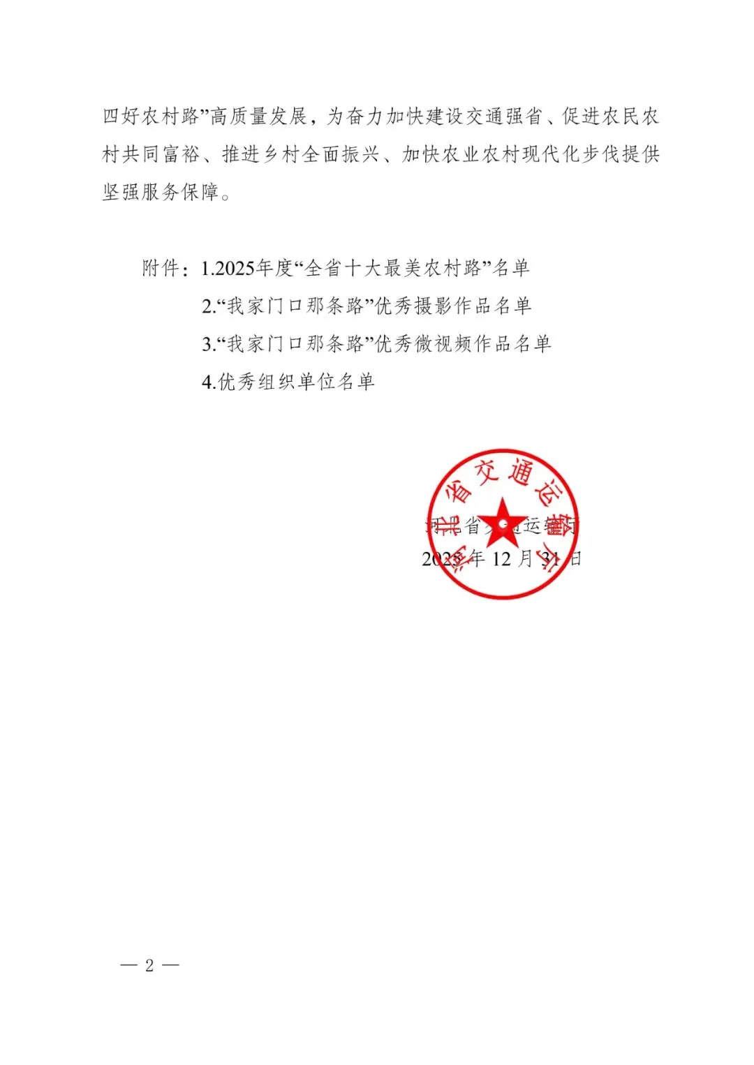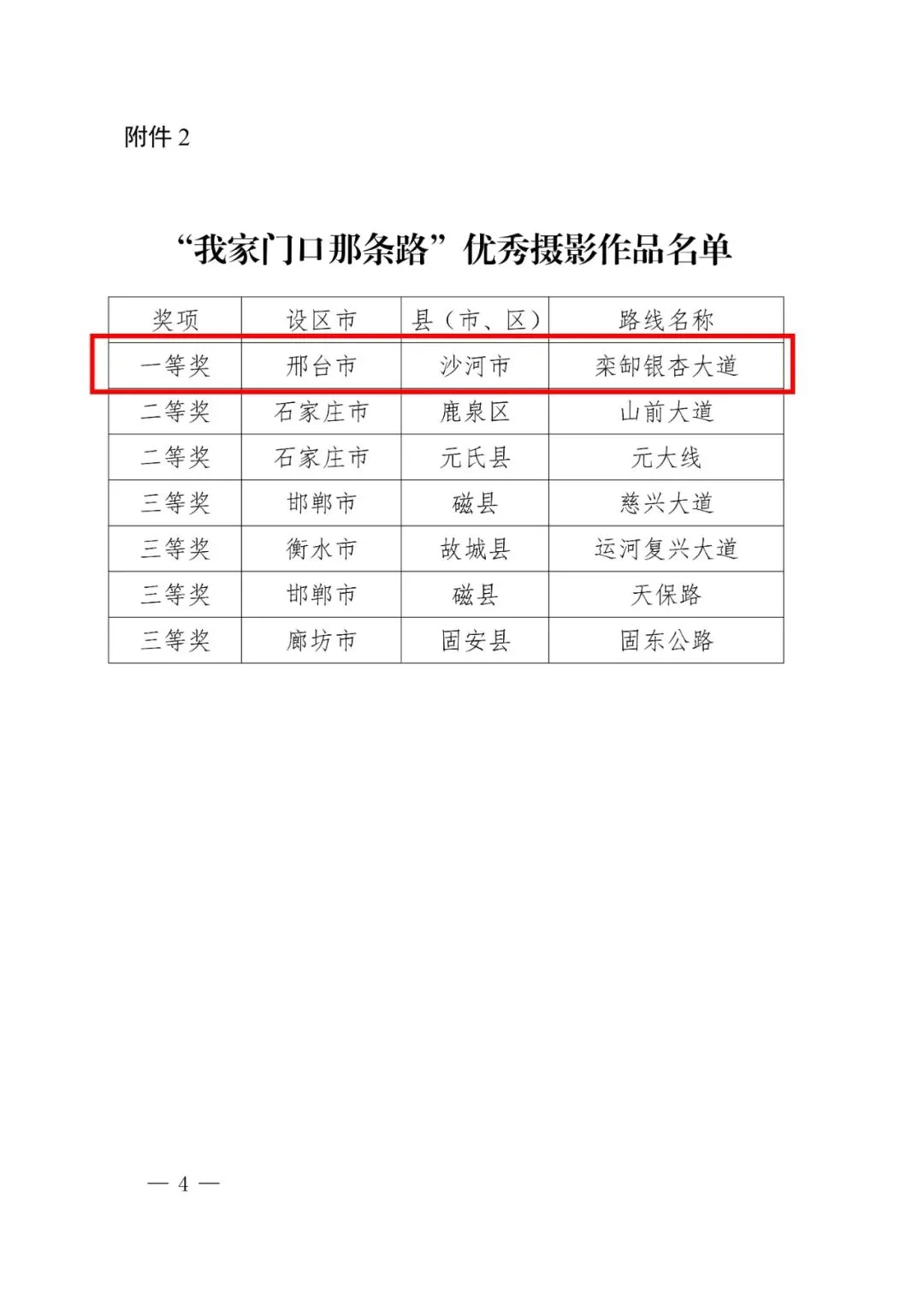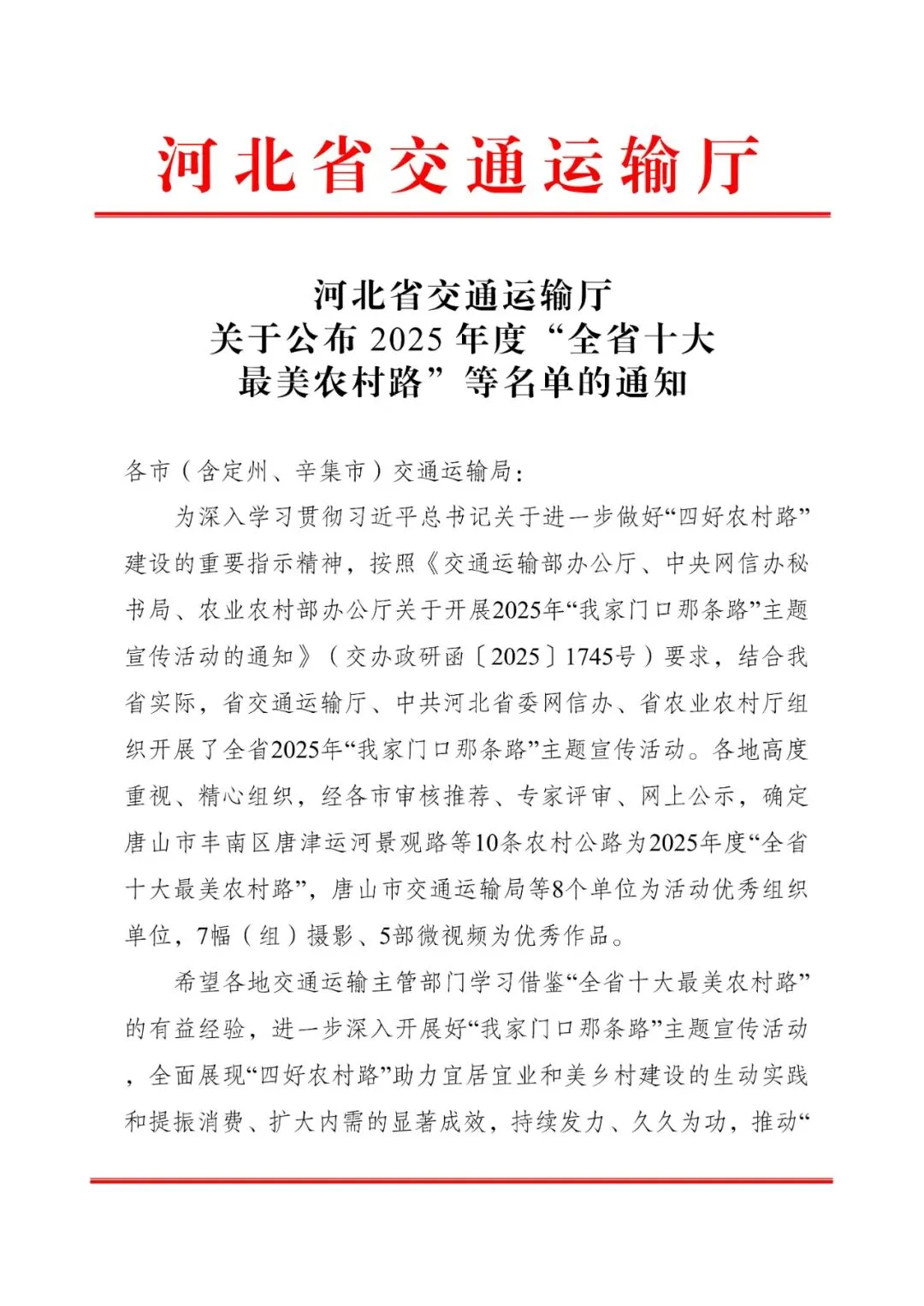 2025年12月31日,河北省交通运输厅发布了《关于公布2025年度“全省十大最美农村路”等名单的通知》,确定10条农村公路为2025年度“全省十大最美农村路”,同时公布“我家门口那条路”优秀摄影、微视频作品名单。其中,邢台市交通运输局获评2025年度“我家门口那条路”主题宣传活动优秀组织单位称号;南和区兴业路获评2025年度“全省十大最美农村路”;沙河市栾卸银杏大道荣获“我家门口那条路”优秀摄影作品一等奖;沙河市三川贯通路荣获“我家门口那条路”优秀微视频二等奖。